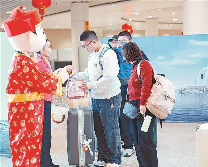 职责主谈主员为刚抵厦的搭客奉上新春福礼。(厦门日报记者 陆晓凤 摄)