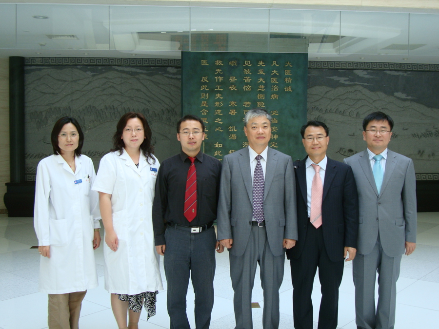 2008年10月21日,釜山大学探听朝阳病院,左一洪原淑医师,左二时任朝阳病院教学处处长邹菁,左四时任韩国釜山大学韩医学特别大学院初任院长李源哲。(图片由受访者提供)