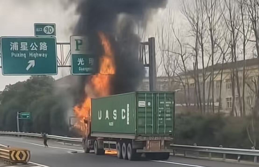 a8体育app最新版 G1503上海绕城高速:集卡车头动怒 黑烟升腾