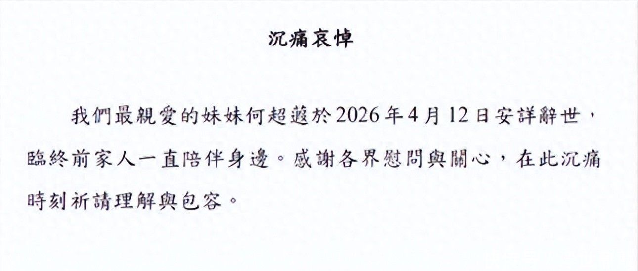 2026年4月12日,年仅60岁的何超蕸因乳腺癌再度恶化,在香港安详离世。