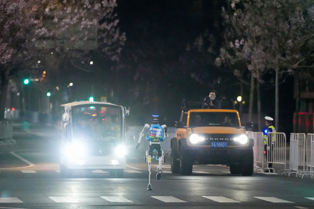 2026年4月11日晚,一台机器东说念主在测试作为中奔走。4月11日晚至4月12日凌晨,2026北京亦庄东说念主形机器东说念主半程马拉松全经由全身分测试作为在北京经开区举行。新华社记者 鞠焕宗 摄