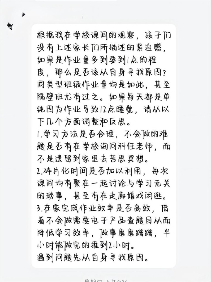 他(她)示意,阐明我方的不雅察,这些孩子对学习并莫得要紧感,要是功课要作念到很晚才睡,应该从自己寻找原因,因为班里总共学生的功课齐是相同的,邻近班尤甚,为什么其他学生齐无须作念到很晚,独一你们孩子要呢?