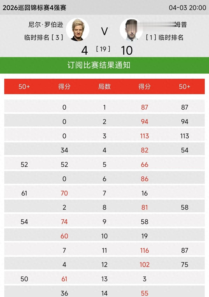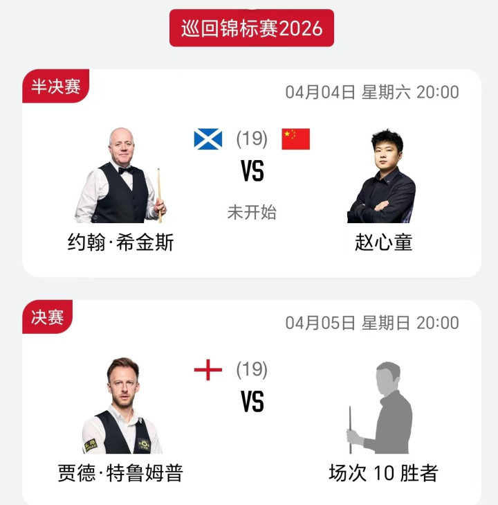 2026巡回锦标赛,特鲁姆普今天凌晨10:4投诚罗伯逊,领先晋级决赛,等侯赵心童与希金斯的胜者,今天晚上及次日凌晨,赵心童将迎战希金斯。