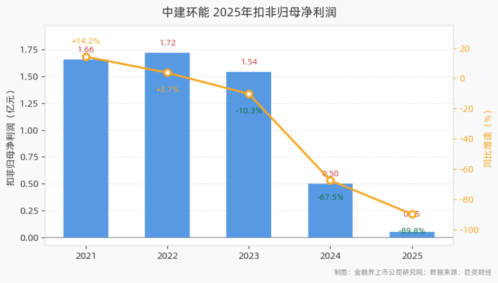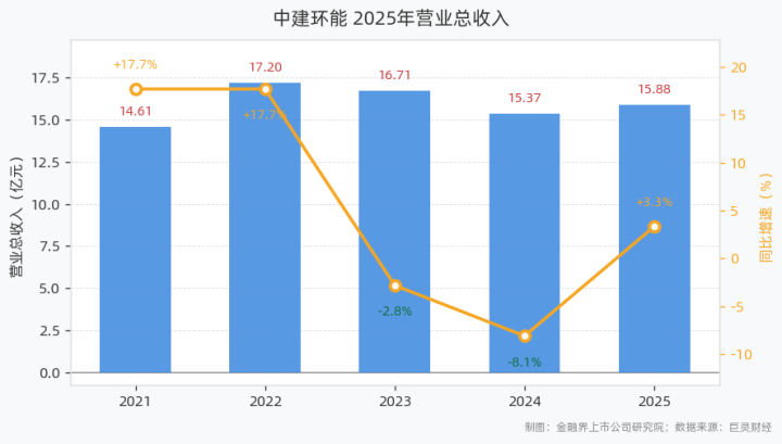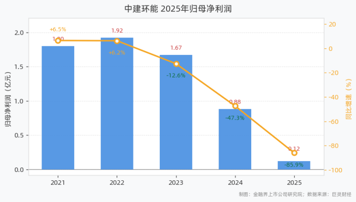 4月23日,中建环能发布2025年年报。领略清楚,2025年公司完结生意总收入15.88亿元,同比增长3.34%;归母净利润0.12亿元,同比下滑85.92%;扣非归母净利润510.66万元,同比下滑89.80%;基本每股收益0.02元,加权平均ROE为0.52%。