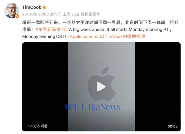 2月26日,苹果公司首席实施官蒂姆·库克在发文浮现,“精彩一周行将到来。一切从太平洋手艺下周一黎明,北京手艺下周一晚间,拉开序幕。”