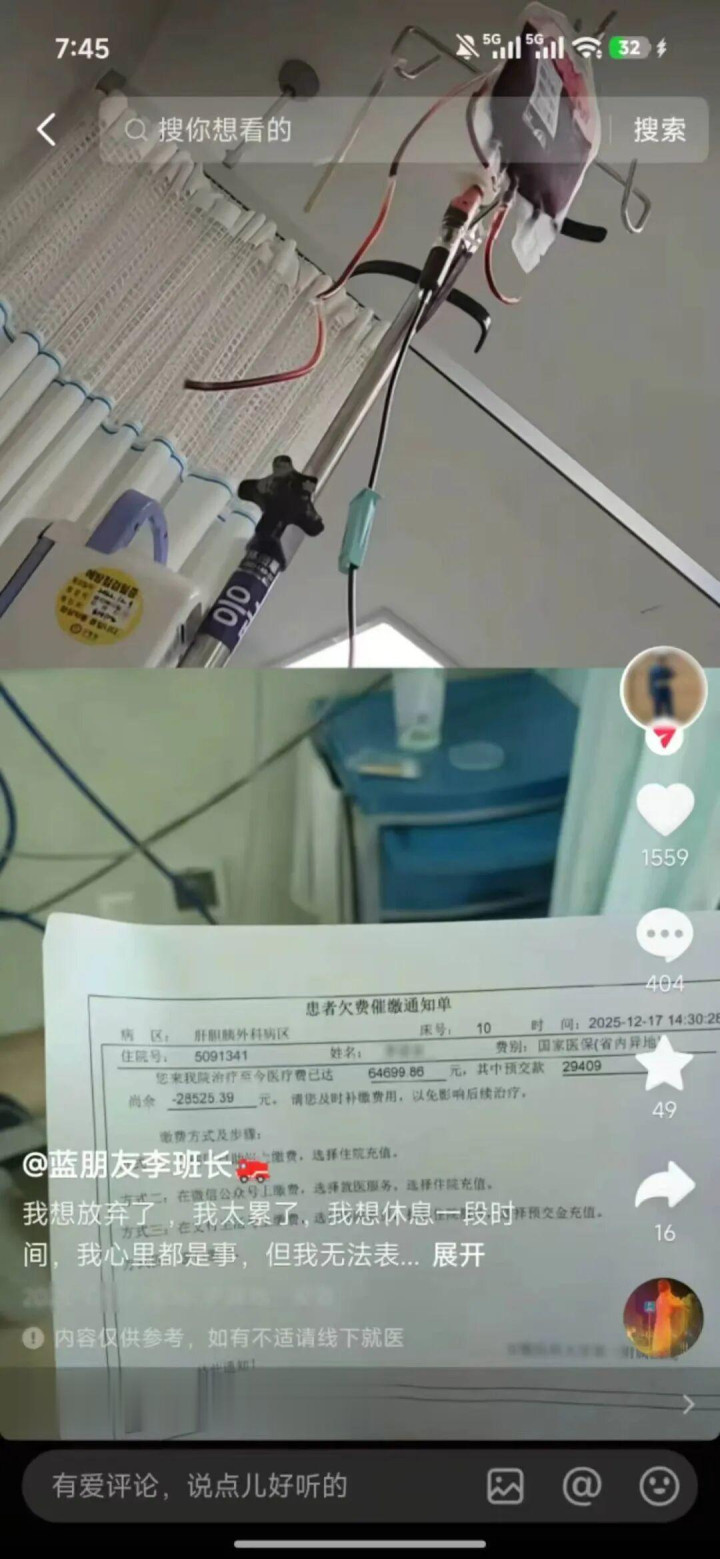 2025年年底,丽姐在短视频平台刷到一个网名为“蓝一又友李班长”的账号,该账号发布了多量消防员测验、抢险救灾浩荡视频,最新作品则是入院、输血关系实质。从发布的作品中了解到,博主自称是别称现役消防员,曾屡次冲锋在抢险救灾一线,如今身患重症,正在入院秉承输血诊治。